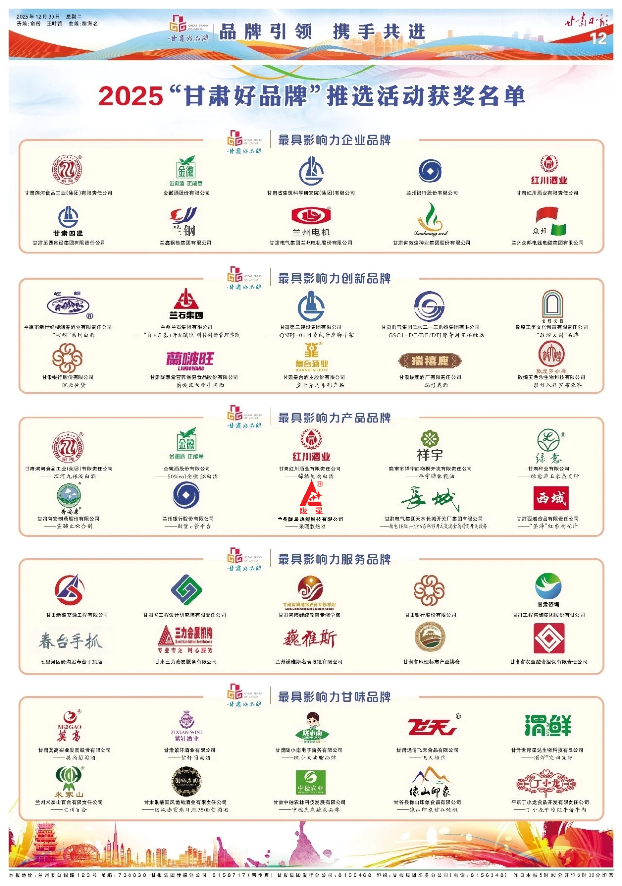 2025年12月30日,《甘肃日报》第11版、第12版以“品牌引领、携手共进”为主题,刊发了2025“甘肃好品牌”推选活动获奖名单。陇星品牌凭借其卓越的产品质量、深厚的品牌积淀与广泛的市场影响力,荣获 “最具影响力产品品牌” 称号。